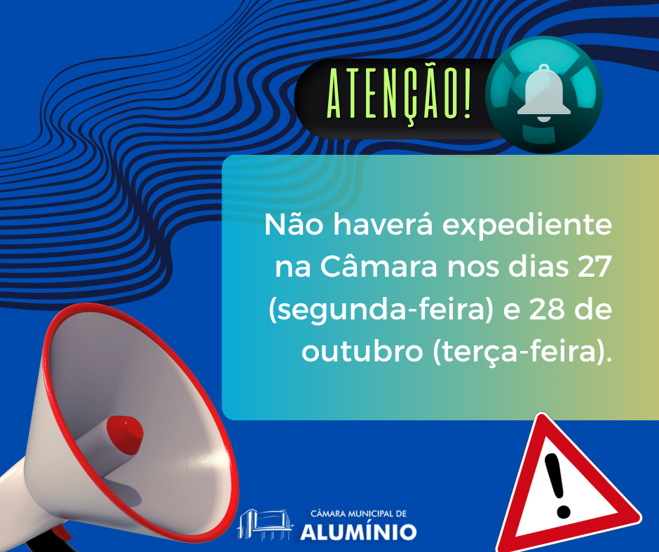 A Câmara Municipal de Alumínio não terá expediente na próxima segunda-feira (27) e terça-feira (28), em comemoração ao Dia do Servidor Público, celebrado em 28 de outubro.
