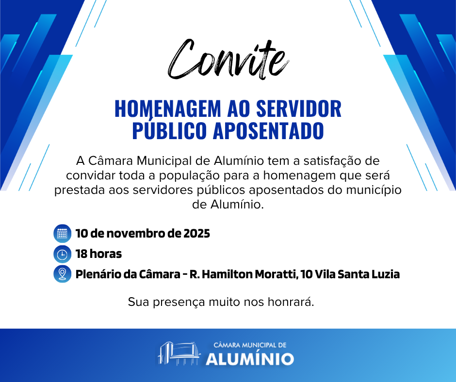 A Câmara Municipal tem a satisfação de convidar toda a população para a homenagem que será prestada aos servidores públicos do município de Alumínio que se aposentaram no último ano.