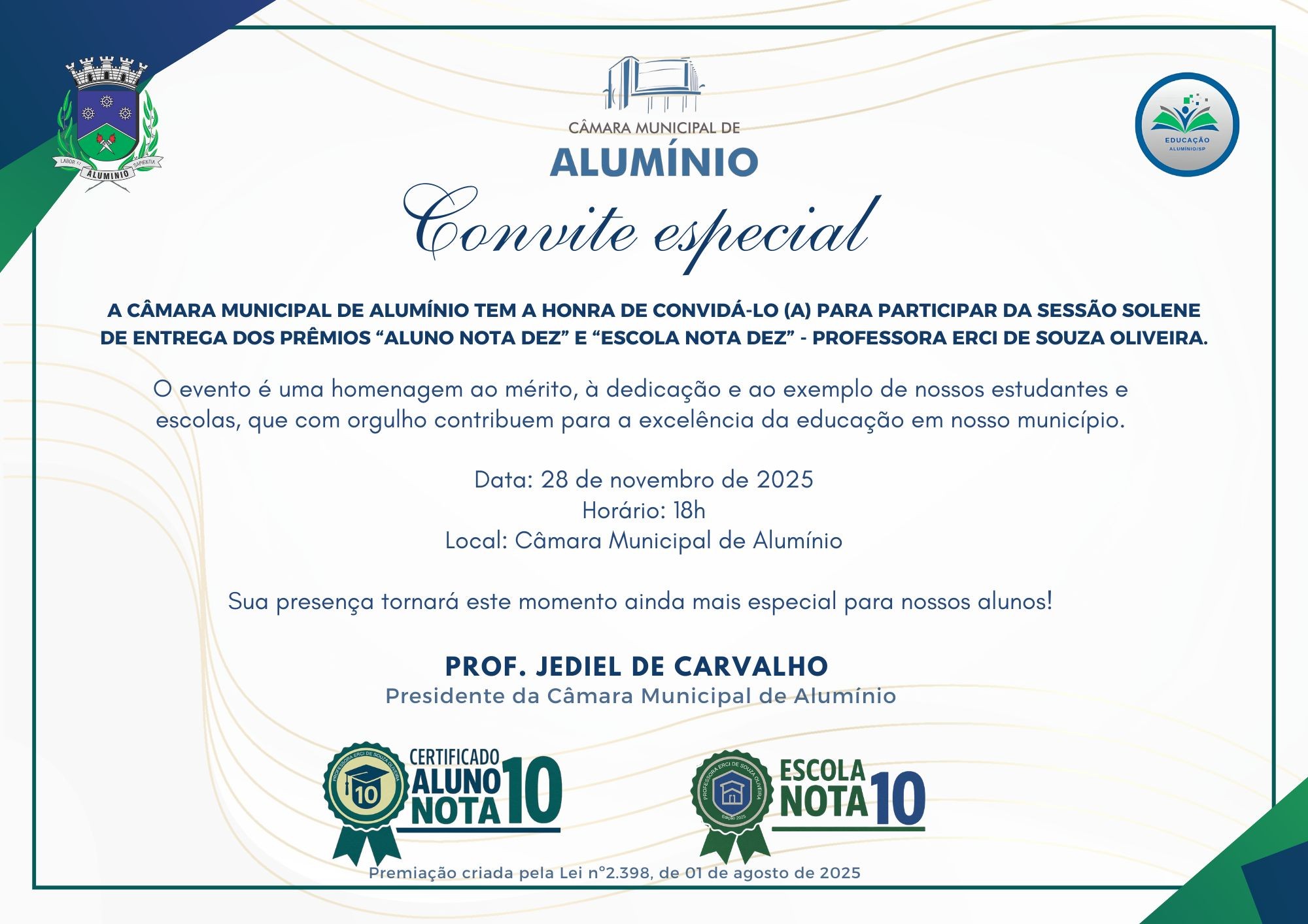 A Câmara Municipal de Alumínio realiza nesta sexta-feira, dia 28 de novembro, a partir das 18 horas, Sessão Solene de entrega da Premiação “Aluno Nota Dez” e “Escola Nota Dez” Professora Erci de Souza Oliveira.