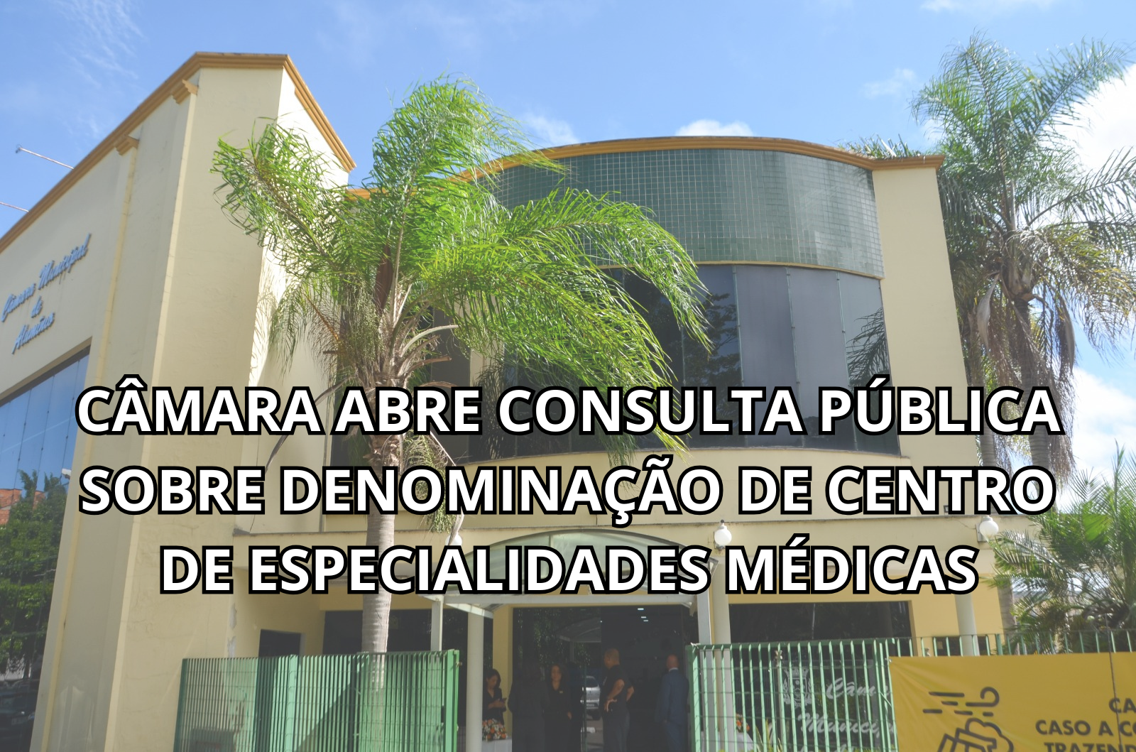 Em cumprimento ao disposto no inciso XIV do Art. 26 da Lei Orgânica do Município, a Câmara de Alumínio abre, a partir desta data, Consulta Pública sobre denominação do Centro de Especialidades Médicas, conforme Projeto de Lei n° 134/2025-L, anexo a esta publicação.