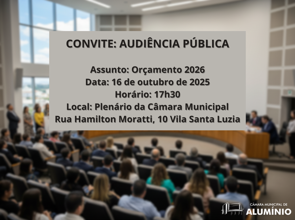 Os membros da Comissão Permanente de Orçamento e Finanças da Câmara Municipal de Alumínio convidam os cidadãos, as associações de moradores e demais entidades interessadas a participarem da Audiência Pública, na qual poderão conhecer e apresentar sugestões ao Projeto de Lei n° 33/2025, de autoria do Poder Executivo, que estima a receita e fixa o limite da despesa (Lei Orçamentária do Município de Alumínio) para o exercício financeiro de 2026 e dá outras providências.