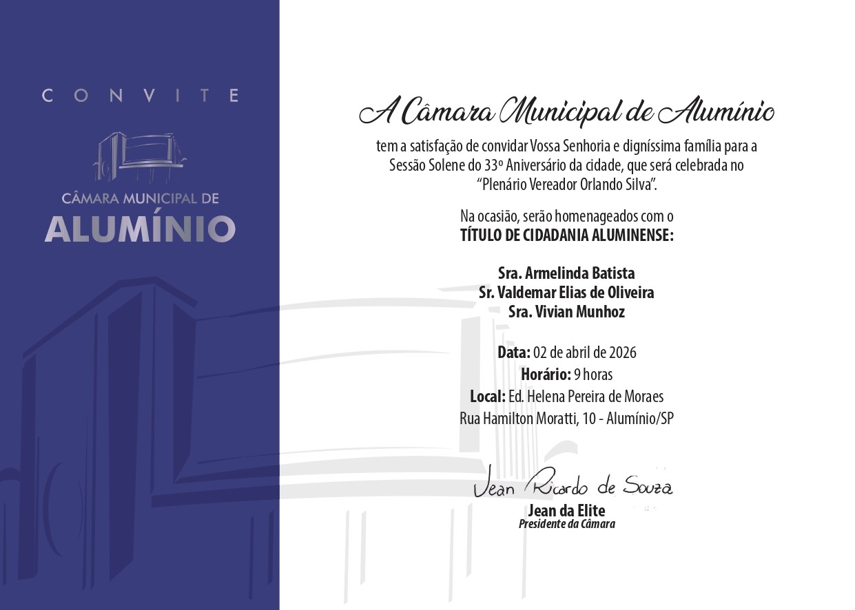 A Câmara Municipal de Alumínio tem a satisfação de convidar Vossa Senhoria e digníssima família para a Sessão Solene do 33º Aniversário da cidade, que será celebrada no "Plenário Vereador Orlando Silva".